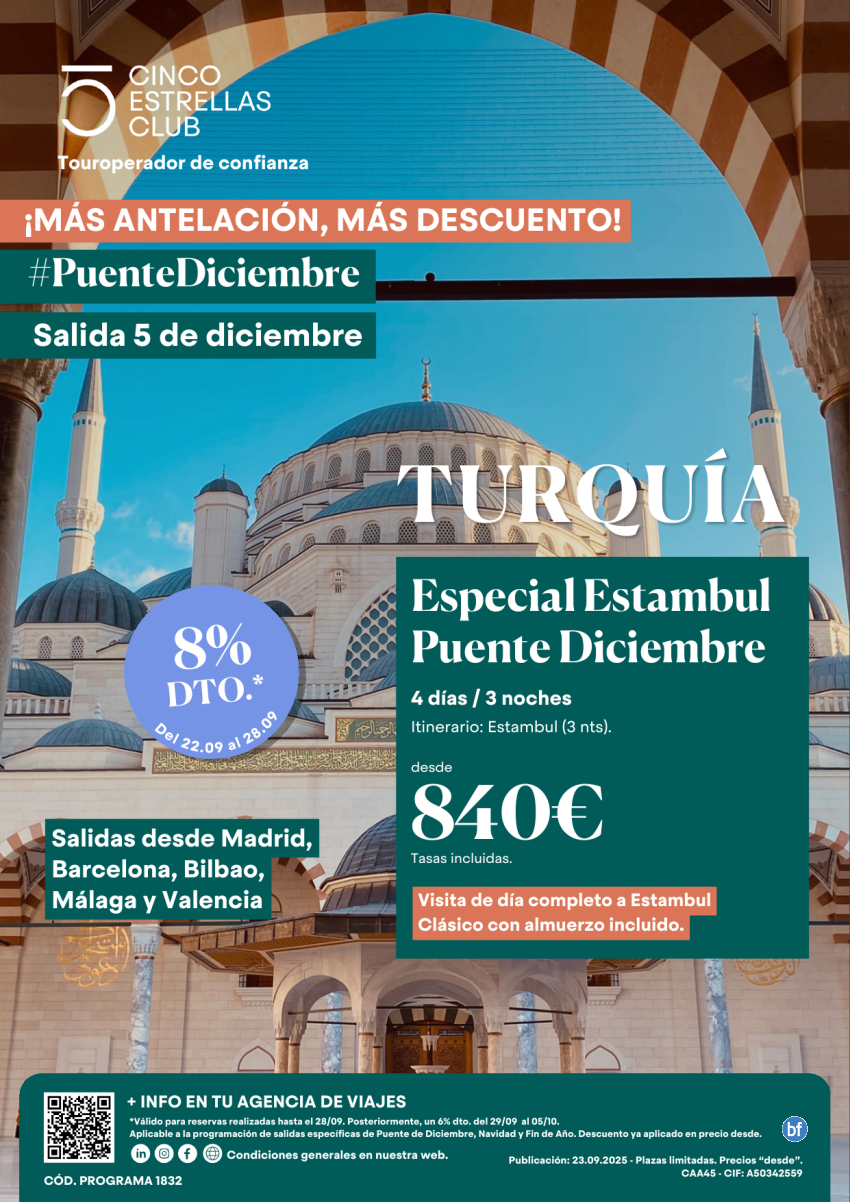 Cupos| 8% dto.Estambul Esp.Pte Diciembre dsd 840€ 4ds/3ns sal. 05 dic dsd Mad, Bcn,Bio,Agp.Vlc